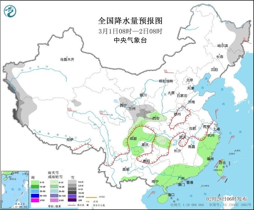 全國降水量預(yù)報圖(2月28日08時-29日08時)