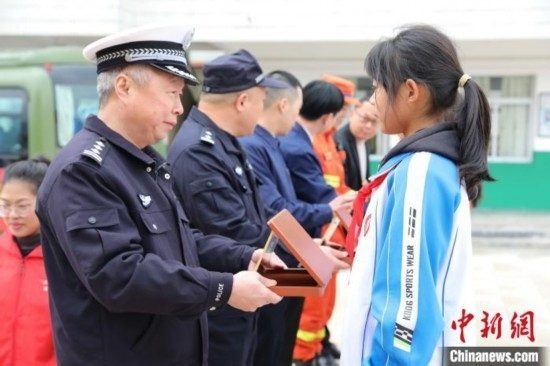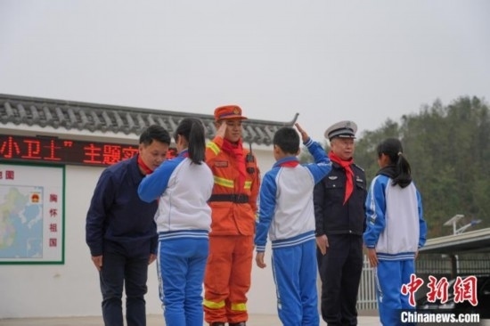 消防員、交警和電力工作人員聯(lián)合為學生代表頒發(fā)“安全小衛(wèi)士”證書,定期對學生傳授相關安全知識。李玲 攝