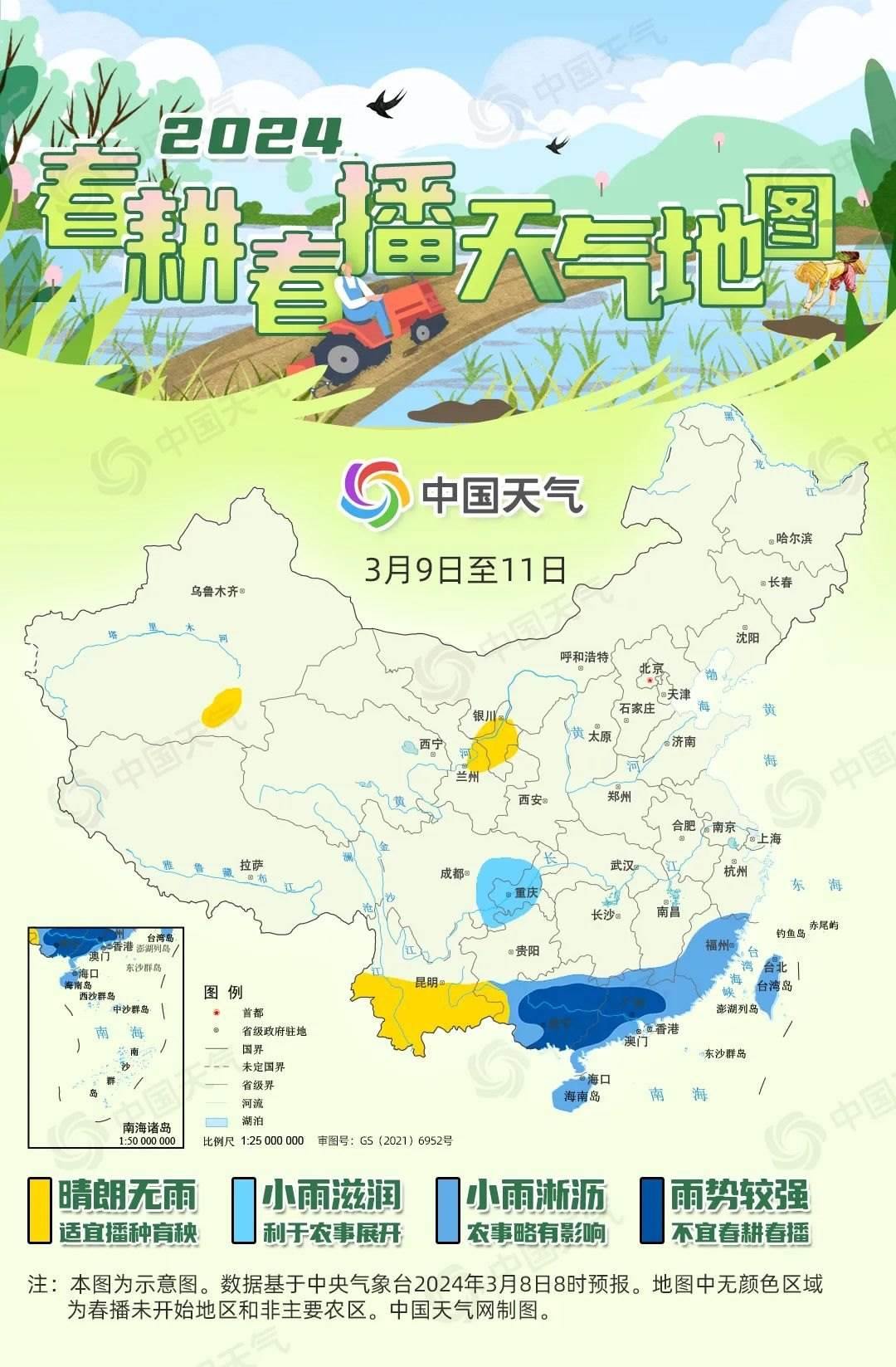 目前,我國春播區(qū)域主要集中在華南,以早稻為主;西南、西北部分地區(qū)也已開始春播,以馬鈴薯、春小麥等為主。明天開始,華南春播區(qū)將迎來一場較強降雨,將對當?shù)氐脑绲静シN育秧有明顯影響。
