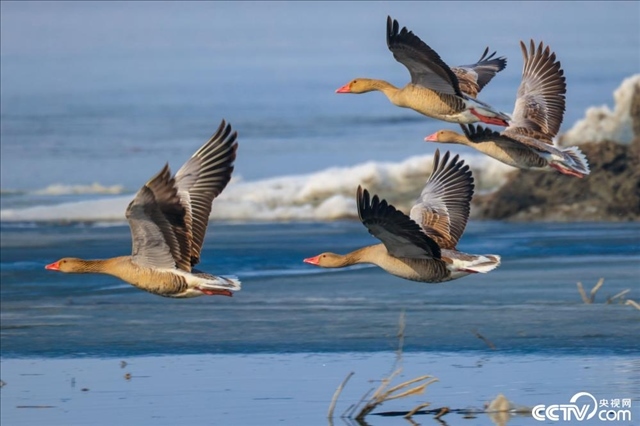 新疆巴州,隨著天氣轉(zhuǎn)暖,冰雪消融的博斯騰湖迎來(lái)大批候鳥。