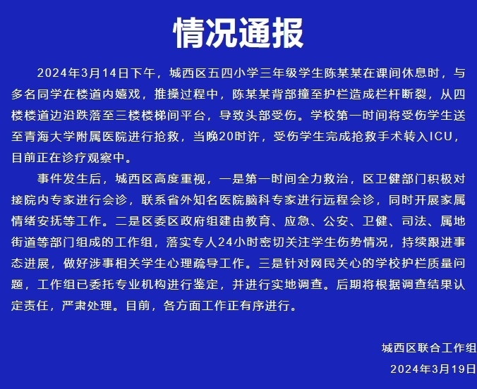 央視網(wǎng)消息:據(jù)“魅力西區(qū)”微信公眾號消息,城西區(qū)聯(lián)合工作組通報,3月14日下午,城西區(qū)五四小學(xué)三年級學(xué)生陳某某在課間休息時,與多名同學(xué)在樓道內(nèi)嬉戲,推搡過程中,陳某某背部撞至護(hù)欄造成欄桿斷裂,從四樓樓道邊沿跌落至三樓樓梯間平臺,導(dǎo)致頭部受傷。學(xué)校第一時間將受傷學(xué)生送至青海大學(xué)附屬醫(yī)院進(jìn)行搶救,當(dāng)晚20時許,受傷學(xué)生完成搶救手術(shù)轉(zhuǎn)入ICU,目前正在診療觀察中。