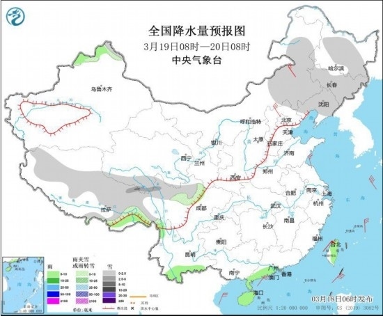 3月19日08時至20日08時,內蒙古東部、東北地區(qū)中南部、西藏北部和東部、青海南部、川西高原北部等地部分地區(qū)有小雪或雨夾雪,其中,西藏東北部等地部分地區(qū)有中到大雪。云南南部、廣東西南部、海南島、臺灣島大部等地部分地區(qū)有小雨。內蒙古中部、河北北部等地部分地區(qū)有4~6級風。