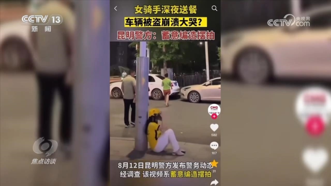 2023年8月3日,某網(wǎng)絡(luò)平臺發(fā)布了一個短視頻,除了哭泣聲,上面文字打的是“深夜,外賣姐姐送餐,下樓發(fā)現(xiàn)車被偷了”。然而,就是這樣一個時長僅10秒左右的視頻,當(dāng)晚瀏覽量已超6000萬次,并在多個平臺迅速傳播,進入熱榜,隨即點贊、收藏量超過10萬次。同樣,這些也引起了警方的關(guān)注,經(jīng)調(diào)查核實,該視頻為擺拍,發(fā)布者就是畫面中表演的女子,其丈夫在旁負(fù)責(zé)道具和指導(dǎo)。而他們當(dāng)時擺拍的全過程被大街上的戶外監(jiān)控記錄了下來。