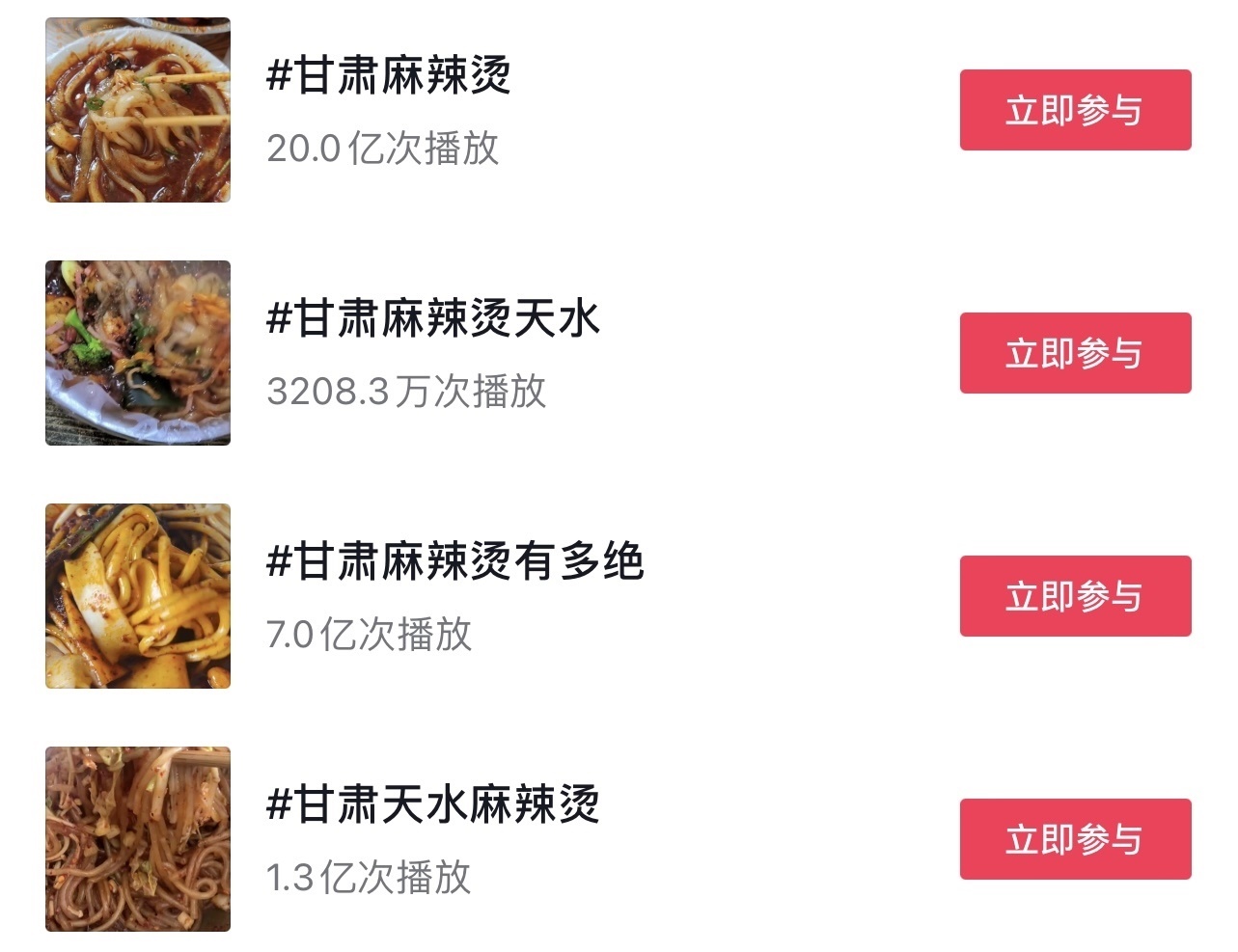“這兩條視頻吸引了大量網(wǎng)民觀看、點(diǎn)贊、轉(zhuǎn)發(fā),之后陸續(xù)有網(wǎng)民發(fā)布相關(guān)視頻。”3月18日,甘肅省文化和旅游廳在回復(fù)網(wǎng)友建議中提到,3月份以來,“甘肅麻辣燙”話題迅速發(fā)酵,視頻內(nèi)容迅速增加,多次登上抖音、快手等短視頻平臺熱榜。截至3月16日18:00,各大短視頻平臺上“甘肅麻辣燙”相關(guān)話題累計(jì)播放量已超過32.6億次。