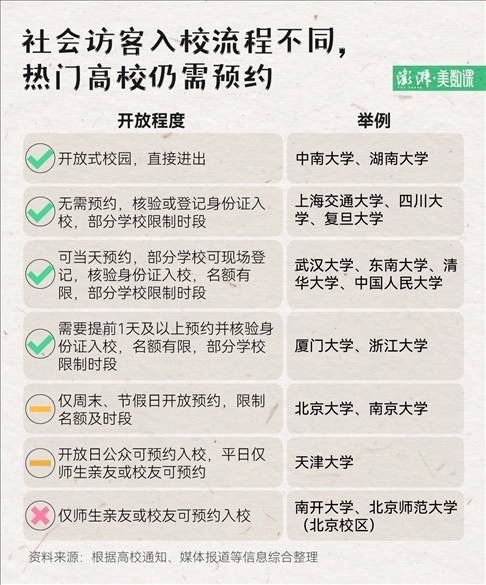還有學(xué)校在訪客人數(shù)、開(kāi)放時(shí)間上,做出了限制:清華大學(xué)工作日開(kāi)放 2000 個(gè)名額,周末、節(jié)假日增加至 1.2 萬(wàn)個(gè);北大、南大等學(xué)校工作日不開(kāi)放,學(xué)期內(nèi)僅周末和法定節(jié)假日開(kāi)放。