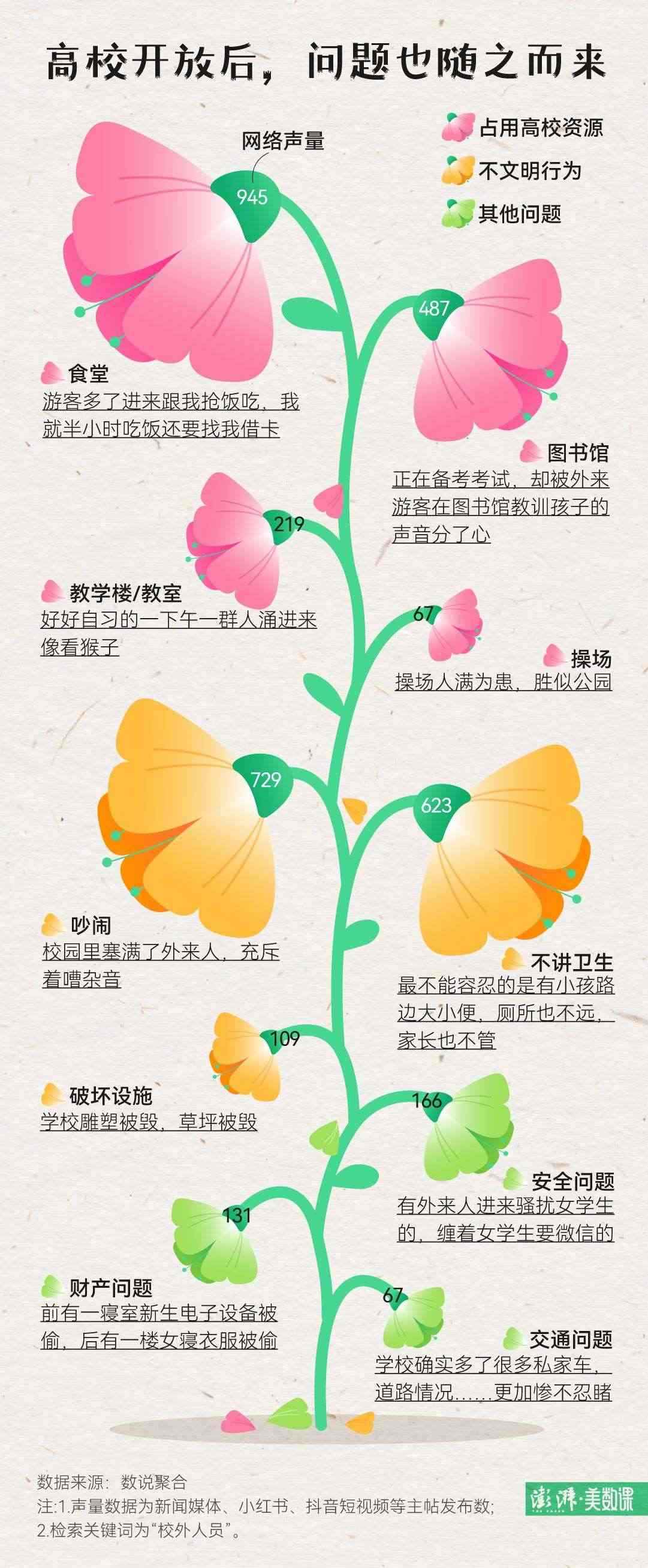 不僅是武大學(xué)生,在社交媒體上,不少高校學(xué)生近期都表示遇到了類(lèi)似的煩惱。澎湃新聞在數(shù)說(shuō)聚合平臺(tái)上檢索了近一個(gè)月來(lái),包括小紅書(shū)、抖音等在內(nèi)平臺(tái)上提到“校外人員”的帖子后發(fā)現(xiàn),校園開(kāi)放后學(xué)生們最大的困擾,就是游客太多,導(dǎo)致食堂、圖書(shū)館等校園資源被侵占。