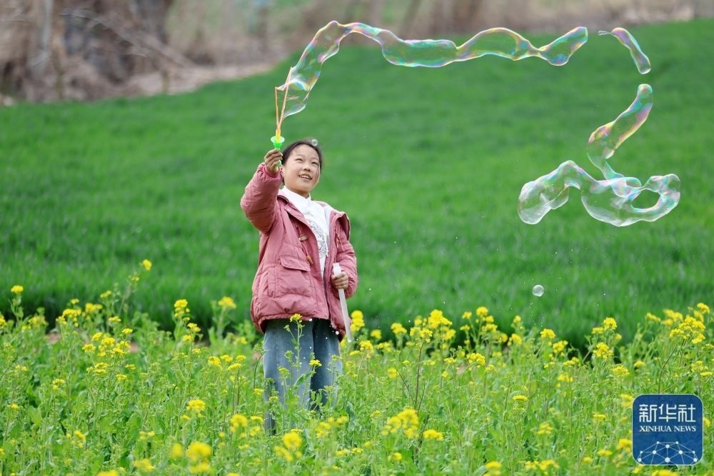 3月23日,山東省臨沂市郯城縣郯城街道陵坡村一名小女孩在田間玩泡泡。新華社發(fā)(張春雷攝)