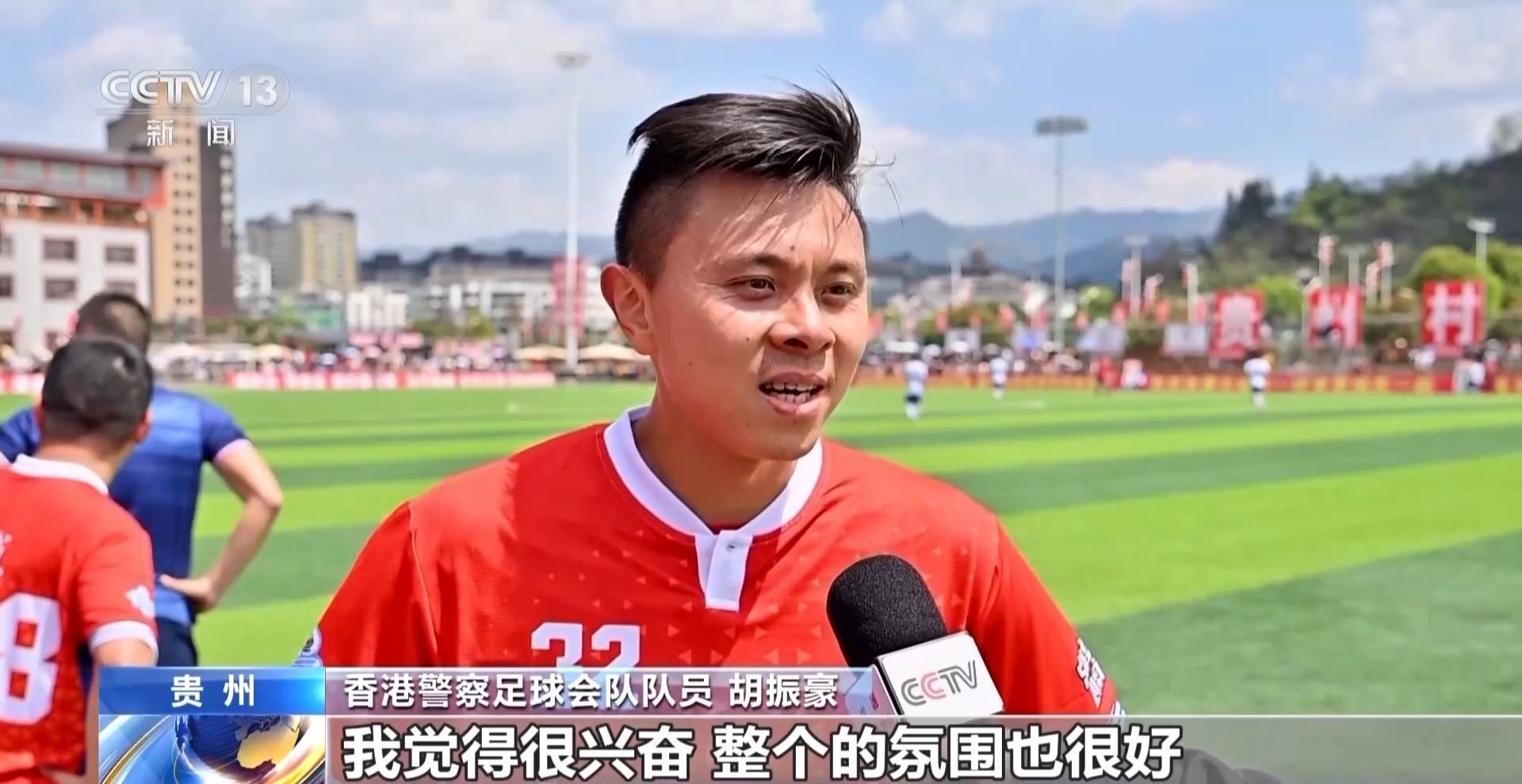香港警察足球會(huì)隊(duì)隊(duì)長(zhǎng) 陳憲鈞:這是我們第一次來(lái)貴州,給我們的印象很深,人們都很熱情,我們很開(kāi)心來(lái)到這里,因?yàn)樵谙愀畚覀円部催^(guò)“村超”的現(xiàn)場(chǎng),所以我們有機(jī)會(huì)來(lái)到這里,跟大家一起踢(足球),我覺(jué)得非常開(kāi)心。我們希望可以跟尤其是年輕人多交流,讓他們認(rèn)識(shí)我們香港警隊(duì)。