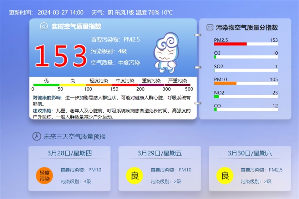 建議措施:兒童、老年人及心臟病、呼吸系統(tǒng)疾病患者避免長時間、高強度的戶外鍛煉,一般人群適量減少戶外運動。