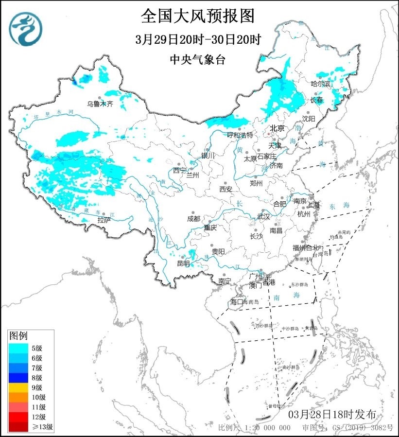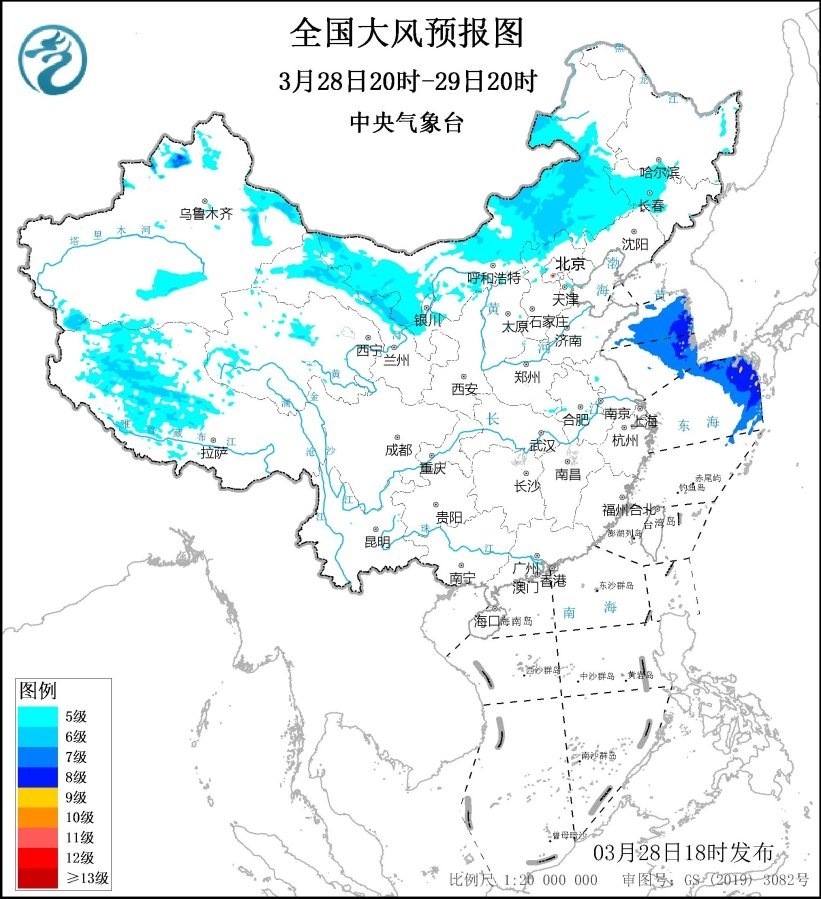 預(yù)計(jì),3月28日20時至29日20時,內(nèi)蒙古大部、吉林西部、遼寧南部、甘肅東部、寧夏北部等地有5~6級、陣風(fēng)7~9級風(fēng);黃海中部和南部海域、東海東北部海域?qū)⒂?~8級、陣風(fēng)9級風(fēng),其中東海東北部的部分海域風(fēng)力可達(dá)9級、陣風(fēng)10級。