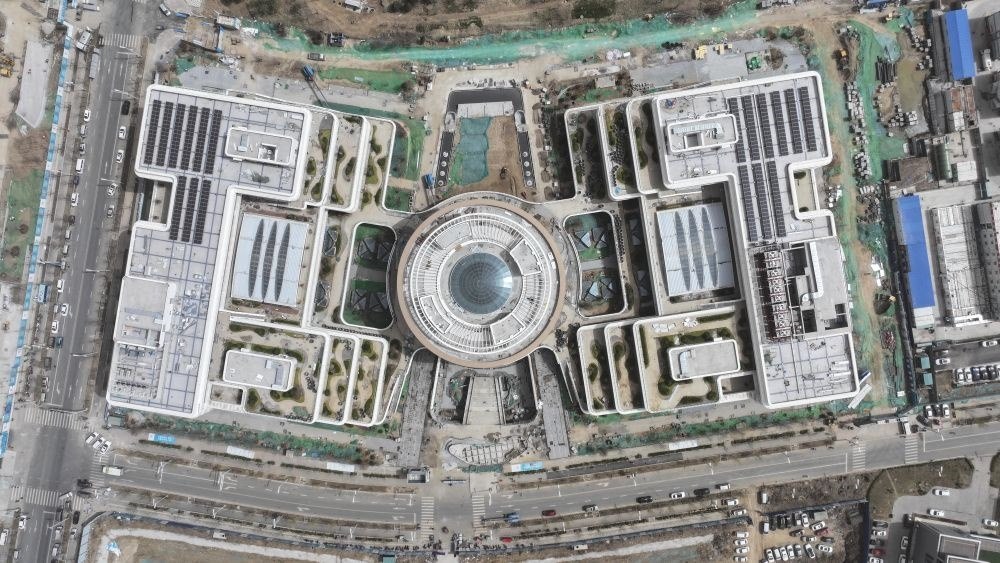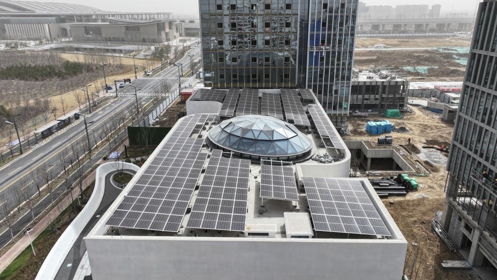 ↑雄安自貿(mào)試驗區(qū)交流展示中心是首批通過新區(qū)專家評審的零碳示范建筑,這是該中心屋頂?shù)墓夥l(fā)電設施(3月28日攝,無人機照片)。