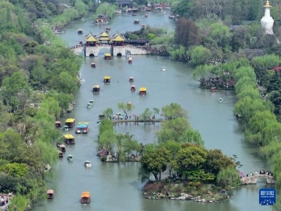 4月4日,人們?cè)诮K揚(yáng)州瘦西湖風(fēng)景區(qū)游玩(無(wú)人機(jī)照片)。