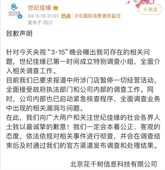 值得一提的是,今年央視3·15晚會(huì)曝光珍愛網(wǎng)、世紀(jì)佳緣、戀愛課等多家婚戀平臺(tái)涉嫌用優(yōu)質(zhì)的異性資源、0門檻的誘人廣告、言之鑿鑿的成功案例作為噱頭,欺騙消費(fèi)者。對此,世紀(jì)佳緣致歉稱,第一時(shí)間成立特別調(diào)查小組,全面介入相關(guān)調(diào)查工作。目前公司已要求報(bào)道中所涉門店暫停一切經(jīng)營活動(dòng),全面接受政府執(zhí)法部門和公司內(nèi)部的調(diào)查工作。同時(shí),公司內(nèi)部也已啟動(dòng)緊急核查程序,全面調(diào)查業(yè)務(wù)中出現(xiàn)的相關(guān)漏洞與問題。珍愛網(wǎng)官方微博發(fā)布致歉聲明,稱在第一時(shí)間成立專項(xiàng)小組,采取最嚴(yán)措施,全面深入調(diào)查并立即處理相關(guān)問題。