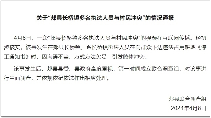 央視網(wǎng)消息:據(jù)“郟縣發(fā)布”公眾號消息,河南省平頂山市郟縣聯(lián)合調(diào)查組發(fā)布情況通報,4月8日,一段“郟縣長橋鎮(zhèn)多名執(zhí)法人員與村民沖突”的視頻在互聯(lián)網(wǎng)傳播。經(jīng)初步核實,該事發(fā)生在郟縣長橋鎮(zhèn),系長橋鎮(zhèn)執(zhí)法人員在向群眾下達違法占用耕地《停工通知書》時,因溝通不當(dāng)、方式方法欠妥,引發(fā)肢體沖突。