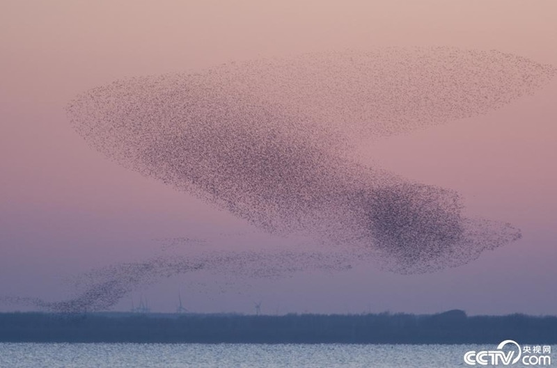 沈陽(yáng)康平縣臥龍湖生態(tài)區(qū)水域上空,數(shù)萬(wàn)只花臉鴨同時(shí)與夕陽(yáng)共舞,形成壯觀的“鳥(niǎo)浪”。