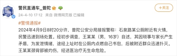 央視網(wǎng)消息:據(jù)@警民直通車_普陀 微博消息,4月9日8時(shí)20分許,上海普陀公安分局接報(bào)警稱:石泉路某公廁附近有火情,民警迅速到場(chǎng)處置。經(jīng)初步調(diào)查,王某某(男,16歲)自述,其因瑣事與家長(zhǎng)產(chǎn)生矛盾,為發(fā)泄情緒,途經(jīng)上址時(shí)在公廁內(nèi)點(diǎn)燃自己書(shū)包,后被附近群眾迅速撲滅。王某某頸背部被灼傷,經(jīng)送醫(yī)治療無(wú)生命危險(xiǎn)。