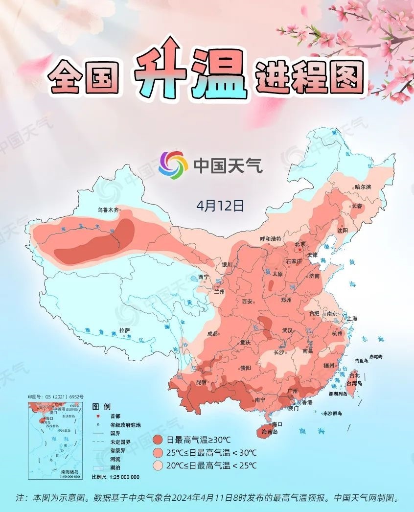 眼下,全國(guó)大部處于冷空氣影響間歇期,升溫是主旋律。預(yù)計(jì)今起三天(4月11日至13日),我國(guó)從北到南都將開(kāi)啟回暖進(jìn)程,最高氣溫25℃以上的區(qū)域幾乎覆蓋整個(gè)中東部,波及20余省份,東北、西北地區(qū)氣溫將大面積創(chuàng)今年以來(lái)新高,北方不少地方還會(huì)體驗(yàn)到常年5月中旬才有的超前暖熱。中國(guó)天氣網(wǎng)推出全國(guó)升溫進(jìn)程圖,看看哪些地方將沖擊30℃。