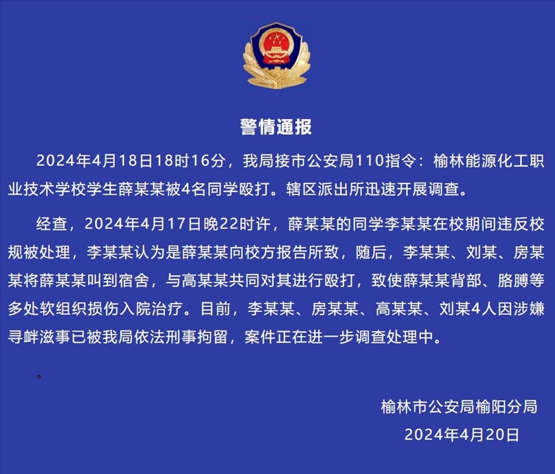 央視網消息:據(jù)陜西榆林公安消息,2024年4月18日18時16分,榆陽公安局接市公安局110指令:榆林能源化工職業(yè)技術學校學生薛某某被4名同學毆打。轄區(qū)派出所迅速開展調查。