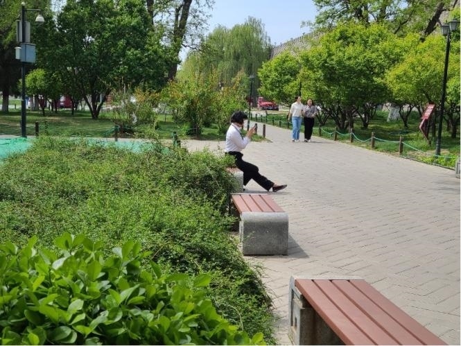 中午1時,走進(jìn)北京明城墻遺址公園,春色襲人。玉棠廣場中,半數(shù)以上的人身著偏正式服裝或佩戴著工牌。他們有的獨坐小憩,有的兩人結(jié)伴,有的三五成群。在亭廊軒組合處,四位女士圍坐在一起交流生活中的小事,不時傳出陣陣笑聲。
