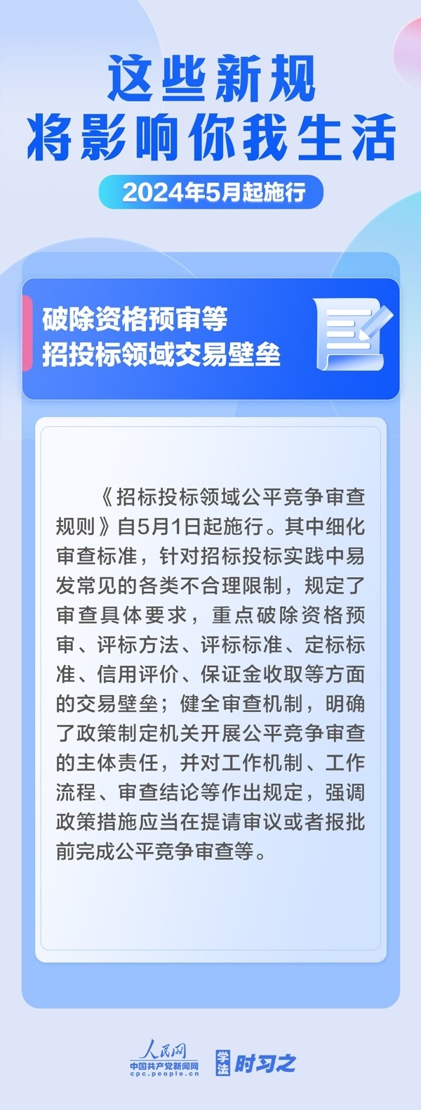 促進(jìn)非銀行支付行業(yè)健康發(fā)展;首次對社會組織名稱進(jìn)行統(tǒng)一規(guī)定;破除資格預(yù)審等招投標(biāo)領(lǐng)域交易壁壘……5月起,這些新規(guī)施行,將影響你我生活。