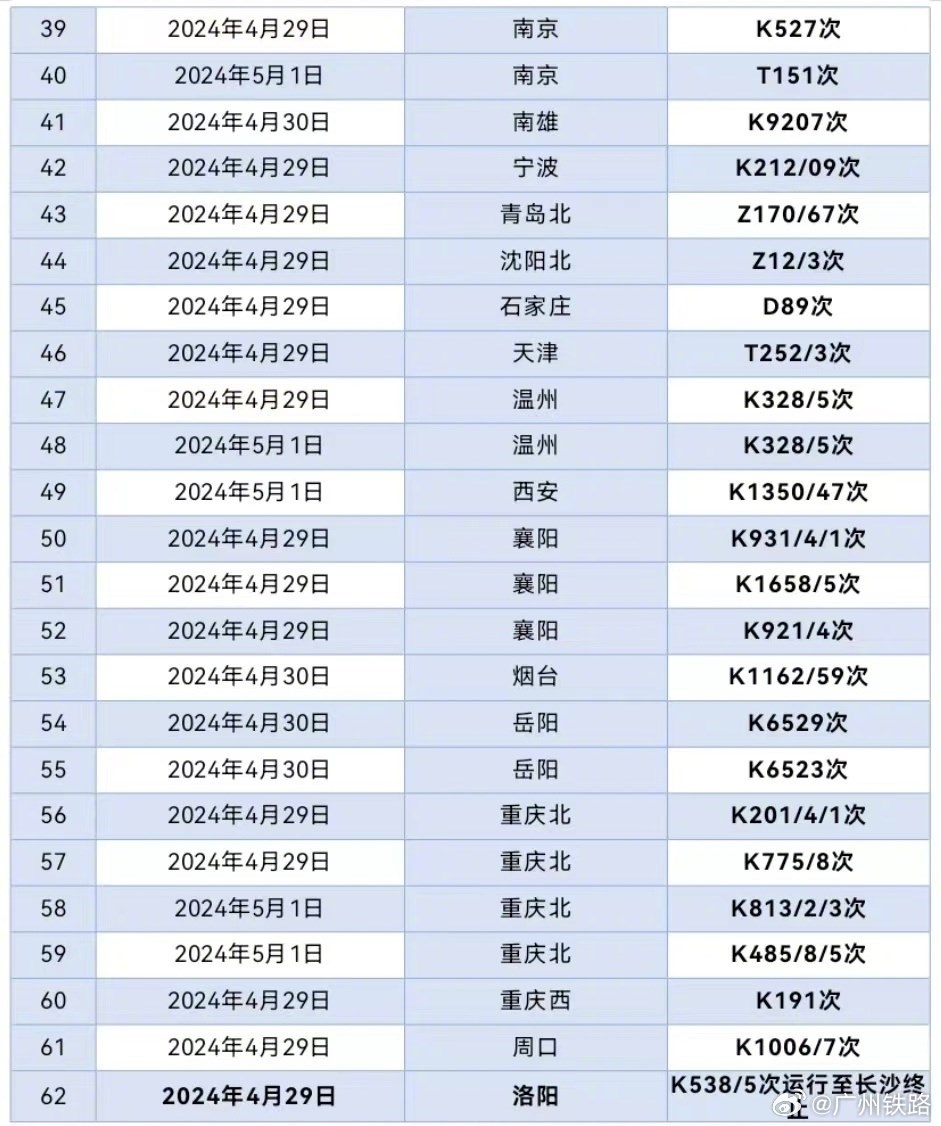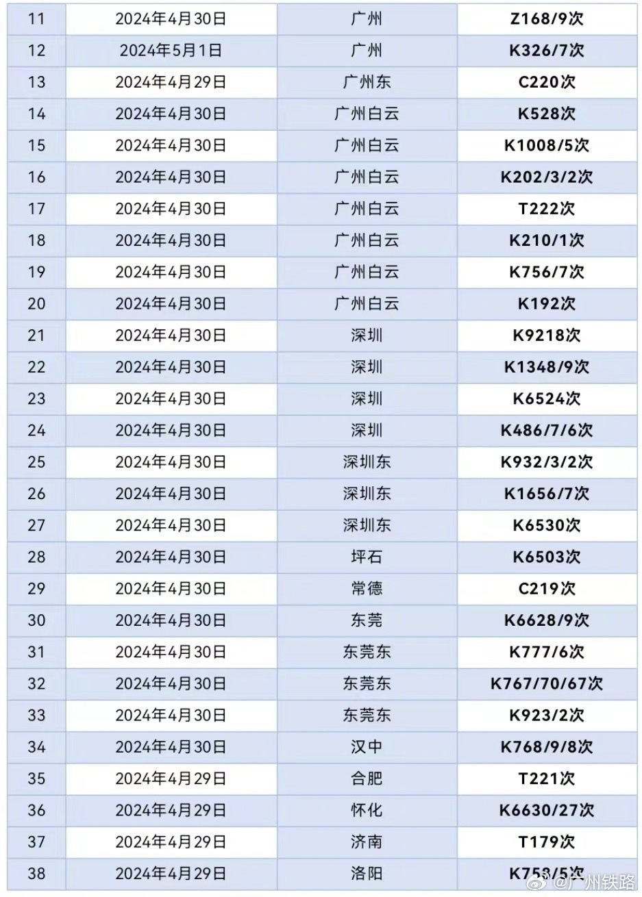 央視網消息:據@廣州鐵路 消息,據廣鐵集團4月29日12時通報,根據氣象部門消息,近期湖南大部、廣東中北部將出現(xiàn)較大范圍的大到暴雨,將對鐵路運輸秩序造成一定的不利影響。廣鐵集團于4月29日至5月1日期間計劃停運京廣鐵路普速列車62列,京廣、京九普鐵和京廣高鐵的部分列車將出現(xiàn)不同程度晚點。