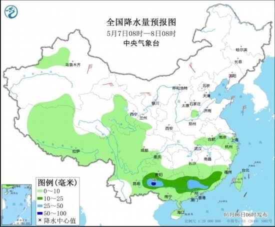 全國降水量預(yù)報圖(5月7日08時-8日08時)