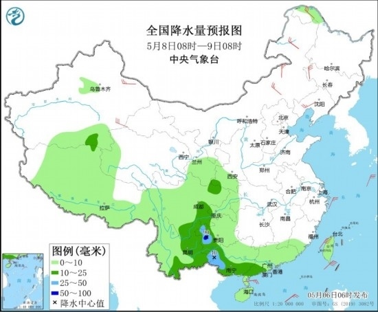 5月8日08時至9日08時,四川盆地東南部、重慶西部、貴州西部、云南東部、廣西西部和南部、廣東南部等地部分地區(qū)有中到大雨,其中,貴州西南部局地有暴雨(50~90毫米)。內(nèi)蒙古中東部、黑龍江西北部、吉林西部、遼寧大部、新疆南疆盆地和東部等地部分地區(qū)有4~6級風(fēng)。東海東北部海域、臺灣海峽、巴士海峽、南海東北部海域?qū)⒂?~6級、陣風(fēng)7級的風(fēng)。