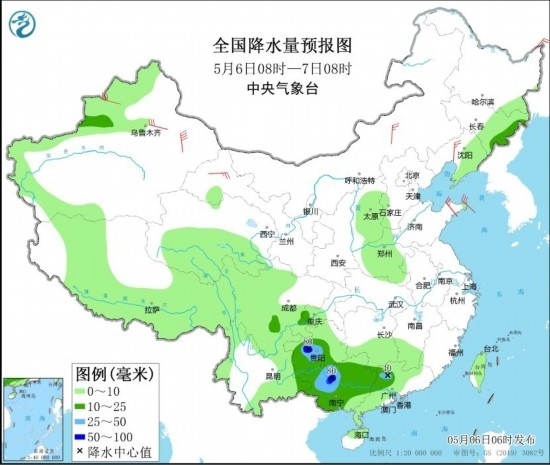 全國降水量預(yù)報圖(5月6日08時-7日08時)