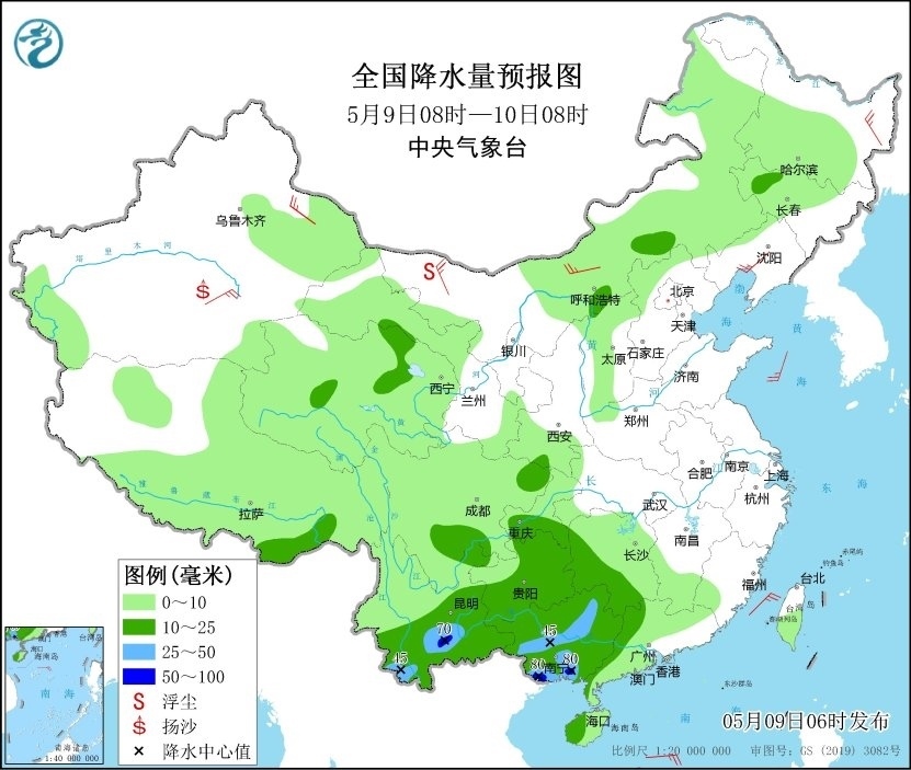 人民網(wǎng)北京5月9日電 (溫璐、高清揚(yáng))據(jù)中央氣象臺(tái)網(wǎng)站消息,昨日,廣東、廣西、海南及貴州、云南、四川、陜西等地部分地區(qū)出現(xiàn)大雨或暴雨,廣西南寧、崇左、百色、欽州及廣東茂名、云浮等局地大暴雨,南寧市區(qū)出現(xiàn)明顯城市內(nèi)澇。預(yù)計(jì)今天,云南、貴州、廣西的降雨還將持續(xù),雨量以中到大雨為主,云南東南部、廣西南部局地有暴雨。另外,5月10日至12日,南方地區(qū)將有新一輪較強(qiáng)降雨過(guò)程,江南、華南北部及貴州等地的部分地區(qū)先后有大到暴雨,局地大暴雨。
