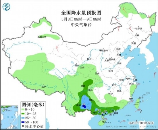 全國降水量預報圖(5月8日08時-9日08時)