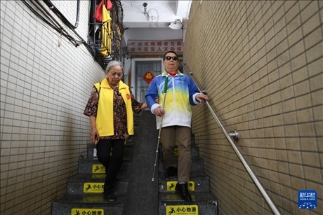 4月15日,馮懿蘋(右)與成都視障者互助協(xié)會家屬志愿者為樂隊成員準備午飯。新華社記者 胥冰潔 攝