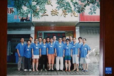 這是4月15日翻拍的張世維(前排右四)與當年按摩店店員們的合影。新華社記者 胥冰潔 攝