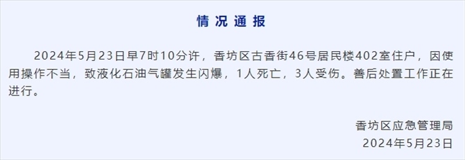 央視網(wǎng)消息:哈爾濱市香坊區(qū)應(yīng)急管理局發(fā)布情況通報(bào),2024年5月23日早7時(shí)10分許,香坊區(qū)古香街46號(hào)居民樓402室住戶,因使用操作不當(dāng),致液化石油氣罐發(fā)生閃爆,1人死亡,3人受傷。善后處置工作正在進(jìn)行。