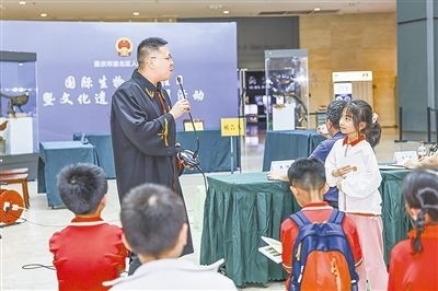 圖①:法官在珍品庫(kù)房為小學(xué)生講解野生動(dòng)物保護(hù)法律知識(shí)。