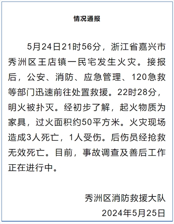 經(jīng)初步了解,起火物質(zhì)為家具,過火面積約50平方米。火災(zāi)現(xiàn)場(chǎng)造成3人死亡,1人受傷,后傷員經(jīng)搶救無效死亡。目前,事故調(diào)查及善后工作正在進(jìn)行中。