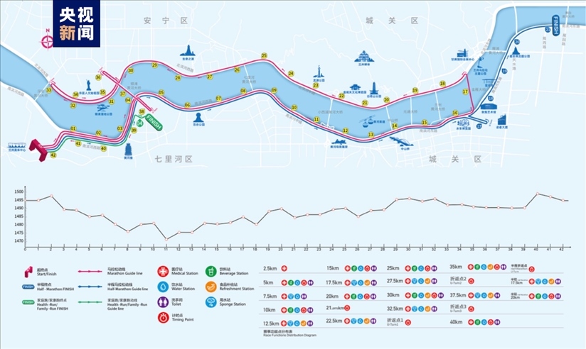 馬拉松所有項(xiàng)目起點(diǎn)為蘭州奧體中心,全程馬拉松終點(diǎn)與起點(diǎn)相同,半程馬拉松終點(diǎn)在南濱河?xùn)|路(軌道二號線雁白大橋站附近),健康跑和家庭跑終點(diǎn)在馬灘北路十字。