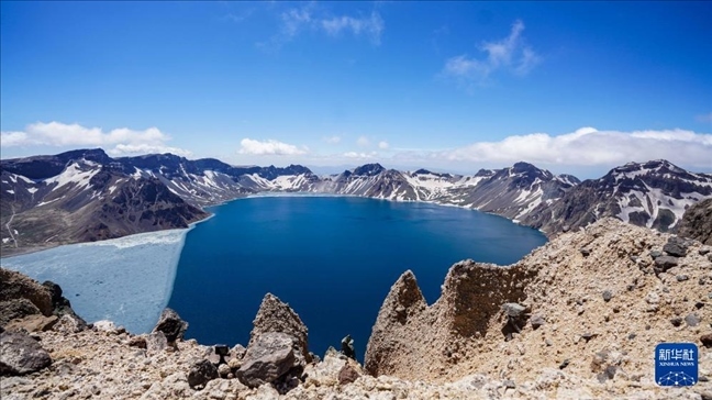 近日,長白山天池冰層逐漸消融,迎來“開冰季”,吸引大量游客前來觀賞。