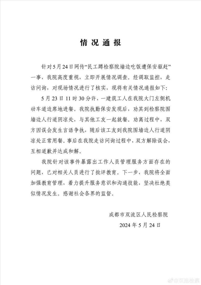 ·成都雙流檢察院回應“民工蹲墻邊吃飯遭保安驅趕”:系誤會已和解。