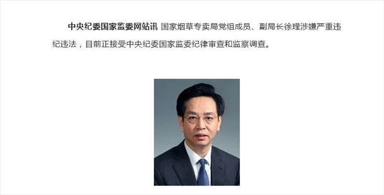 ·國家煙草專賣局黨組成員、副局長接受中央紀委國家監(jiān)委紀律審查和監(jiān)察調查。