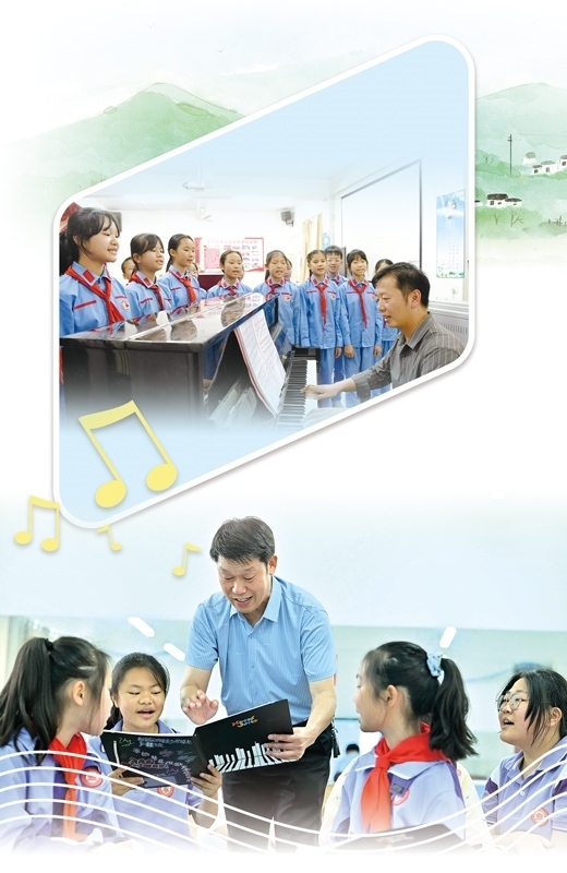 講臺上,隨著廖光新的雙手向前一打開,學(xué)生們齊刷刷地唱了起來?!敖裉焯鞖夂茫フ腋赂拢ㄍ馄牛﹪D……”稚嫩而清脆的聲音瞬間充滿整個教室,透過窗戶傳向遠(yuǎn)處的大山。