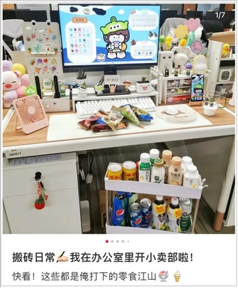 除此之外,還有人在工位養(yǎng)魚、寄居蟹、水母、蟑螂等寵物;有人在工位開起了“小賣部”,吃的喝的樣樣俱全;有人環(huán)繞工位放上了靠墊、坐墊、抱枕、毛毯、沙發(fā)椅,保證隨時可以躺、靠、臥,主打一個舒適。