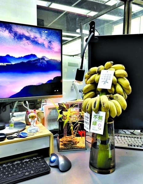 “現(xiàn)在大家工作都挺累的,職場里稍微有一點令人感到驚喜和有趣的話題,大家好像就會變得很開心?!眳芹谑且幻来畈┲鳎詮乃_始在辦公桌上養(yǎng)香蕉之后,單位的很多同事都會好奇地走過來瞧瞧。