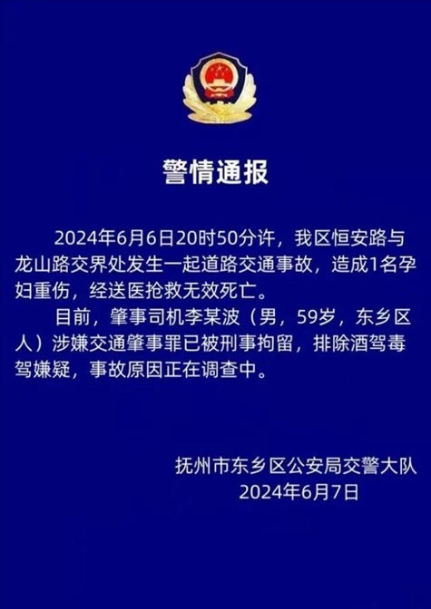 ·江西警方通報(bào)一起致孕婦身亡交通事故:肇事司機(jī)被刑事拘留。