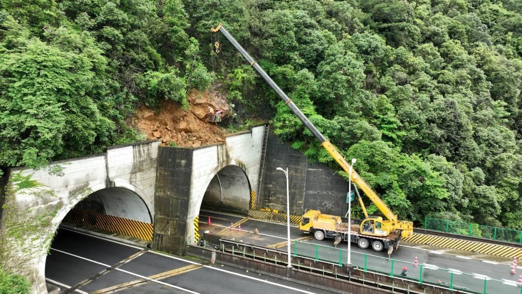 6月12日,南平高速公路養(yǎng)護(hù)部門工作人員在清理隧道頂部松動(dòng)的碎石。(受訪者供圖)