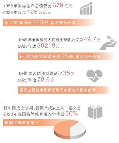 各行各業(yè)的發(fā)展成就,人民生活的蒸蒸日上,濃縮在一組組數據中。與新中國成立初期相比,2023年國內生產總值增長223倍、人均GDP增長89倍、人均預期壽命提高43.6歲、農村貧困人口全部脫貧……國家統(tǒng)計局近日發(fā)布新中國成立75年經濟社會發(fā)展成就系列報告,“數”說75年偉大成就,本版“大數據觀察”欄目推出特別報道,記錄同心同德、艱苦奮斗的奮進歷程,匯聚共襄強國建設、民族復興偉業(yè)的磅礴力量。