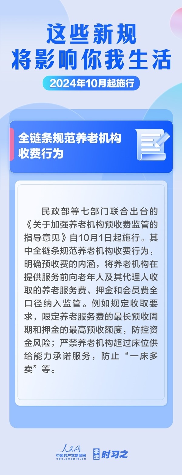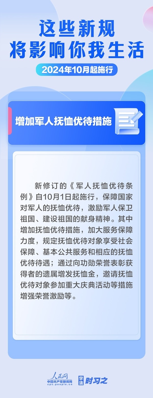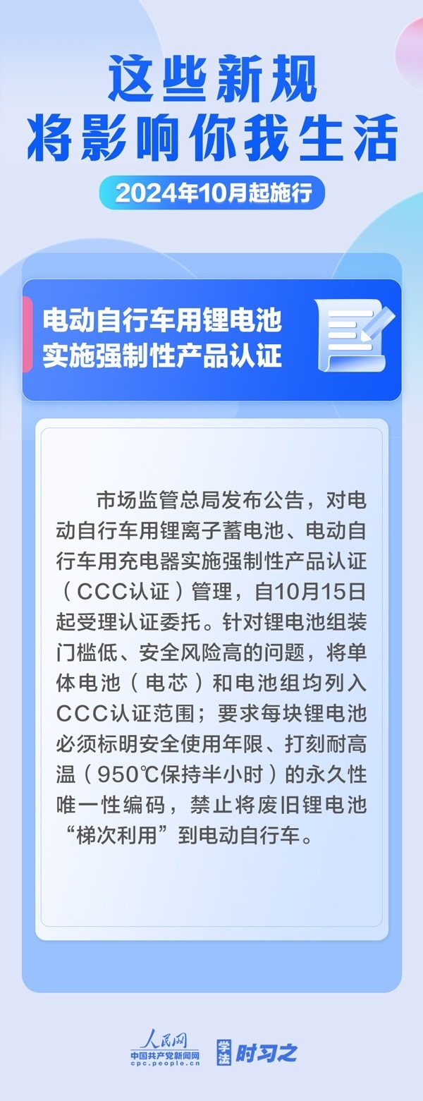 增加軍人撫恤優(yōu)待措施;全鏈條規(guī)范養(yǎng)老機構(gòu)收費行為;電動自行車用鋰電池實施強制性產(chǎn)品認證……10月起,這些新規(guī)施行,將影響你我生活。