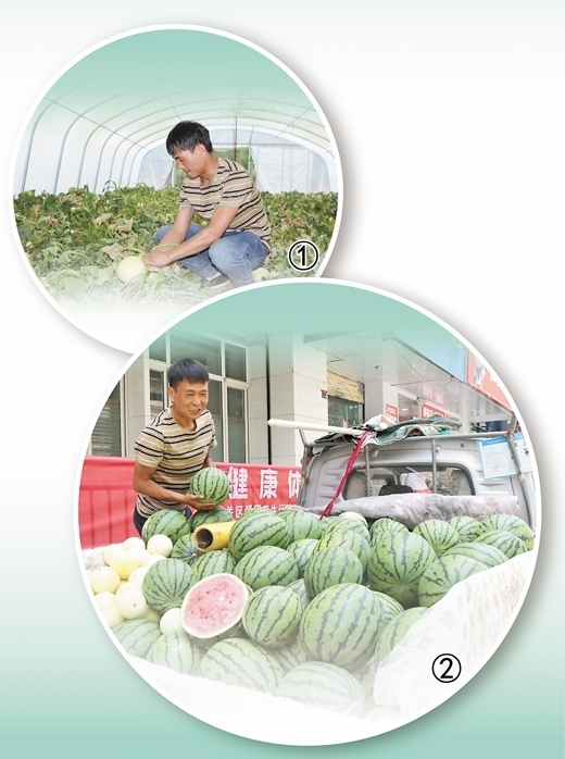 圖①:魏俊治在大棚采摘白蘭瓜。 本報記者 趙帥杰攝 圖②:魏俊治在蘭州城內(nèi)攤點售賣西瓜、白蘭瓜。何宏軍攝(人民視覺)