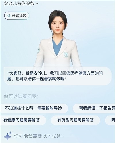 57歲的沈阿姨因?yàn)轭^疼到浙江省人民醫(yī)院就診。在她的手機(jī)屏幕上,一位身著白大褂、長相甜美的數(shù)字醫(yī)生“安診兒”正在為她提供幫助。