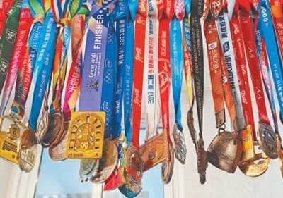 何亞君的馬拉松獎(jiǎng)牌。 本報(bào)記者 易舒冉攝
