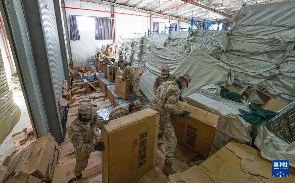 1月8日,在日喀則市經(jīng)開區(qū)物資儲備倉庫,武警官兵在搬運(yùn)抗震救災(zāi)物資。
